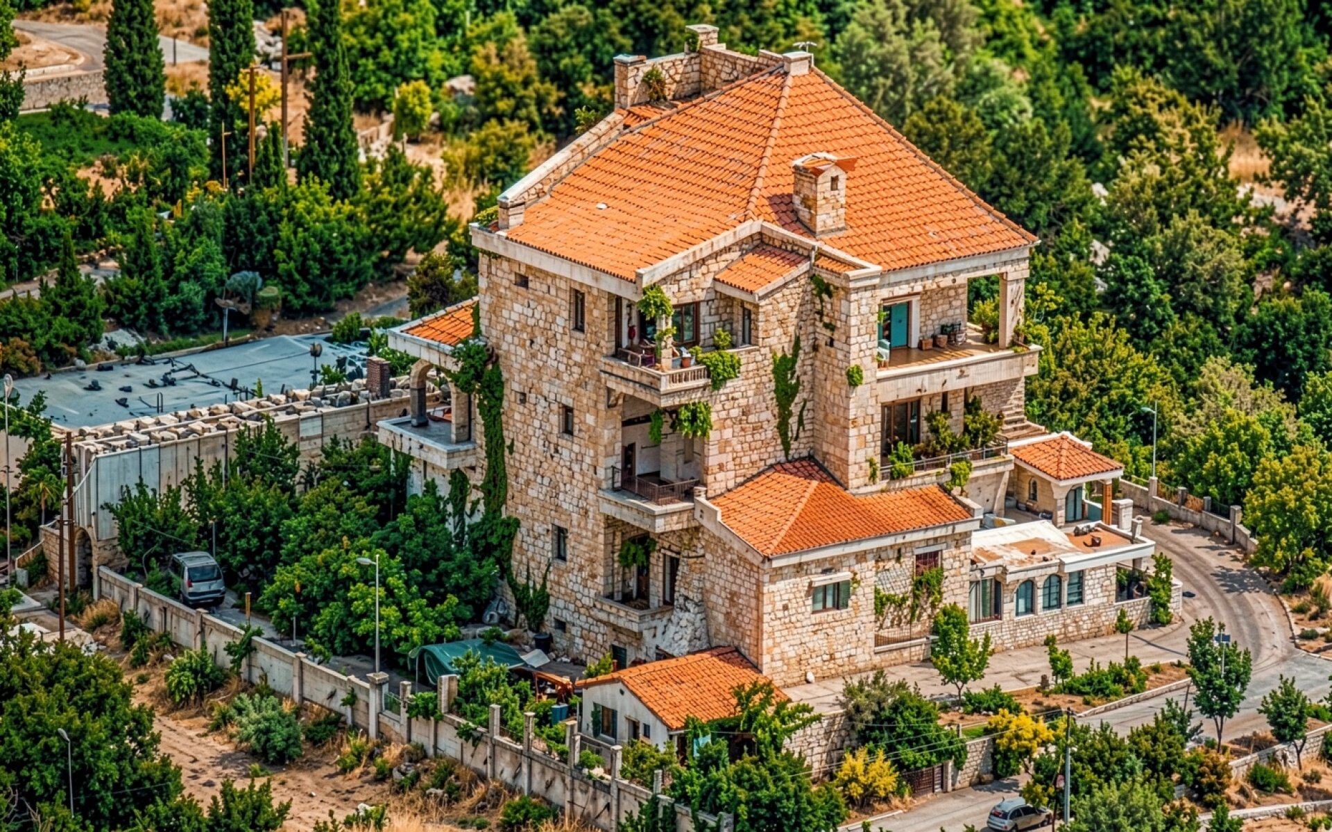 Каменный дом с оранжевой крышей в лесу