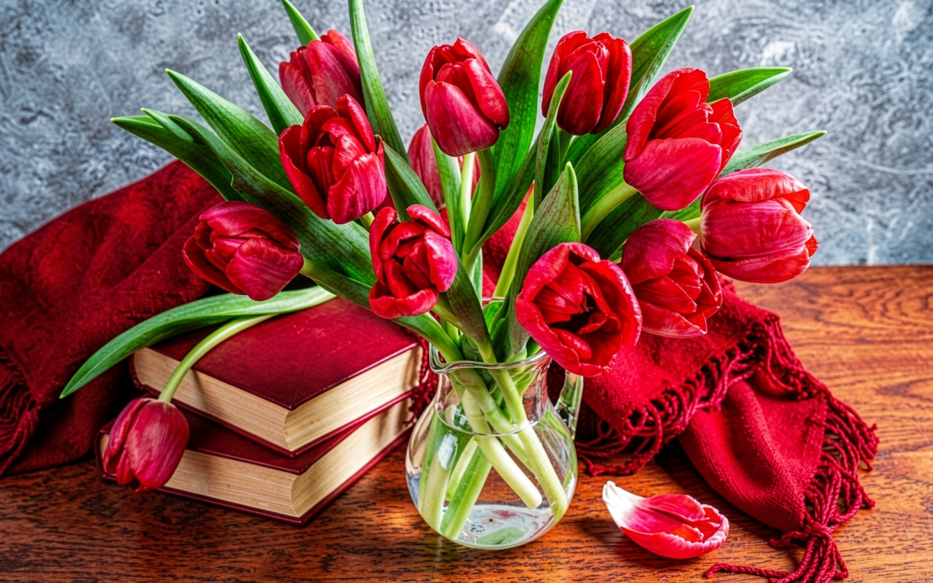 Букет красных тюльпанов в стеклянном кувшине на столе