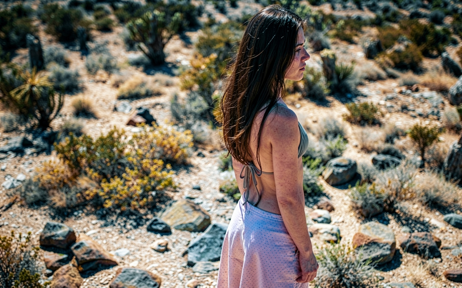 Девушка в пустыне среди камней и кустарников