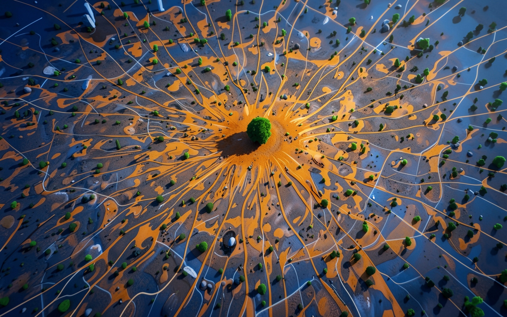 Одинокое зеленое дерево в оранжевом сюрреалистичном ландшафте
