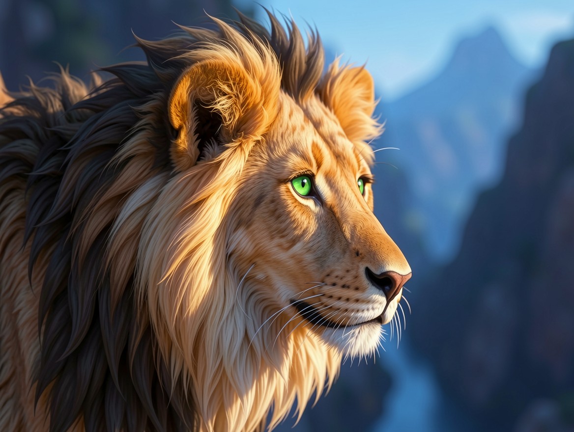 Лев с зелеными глазами в горах