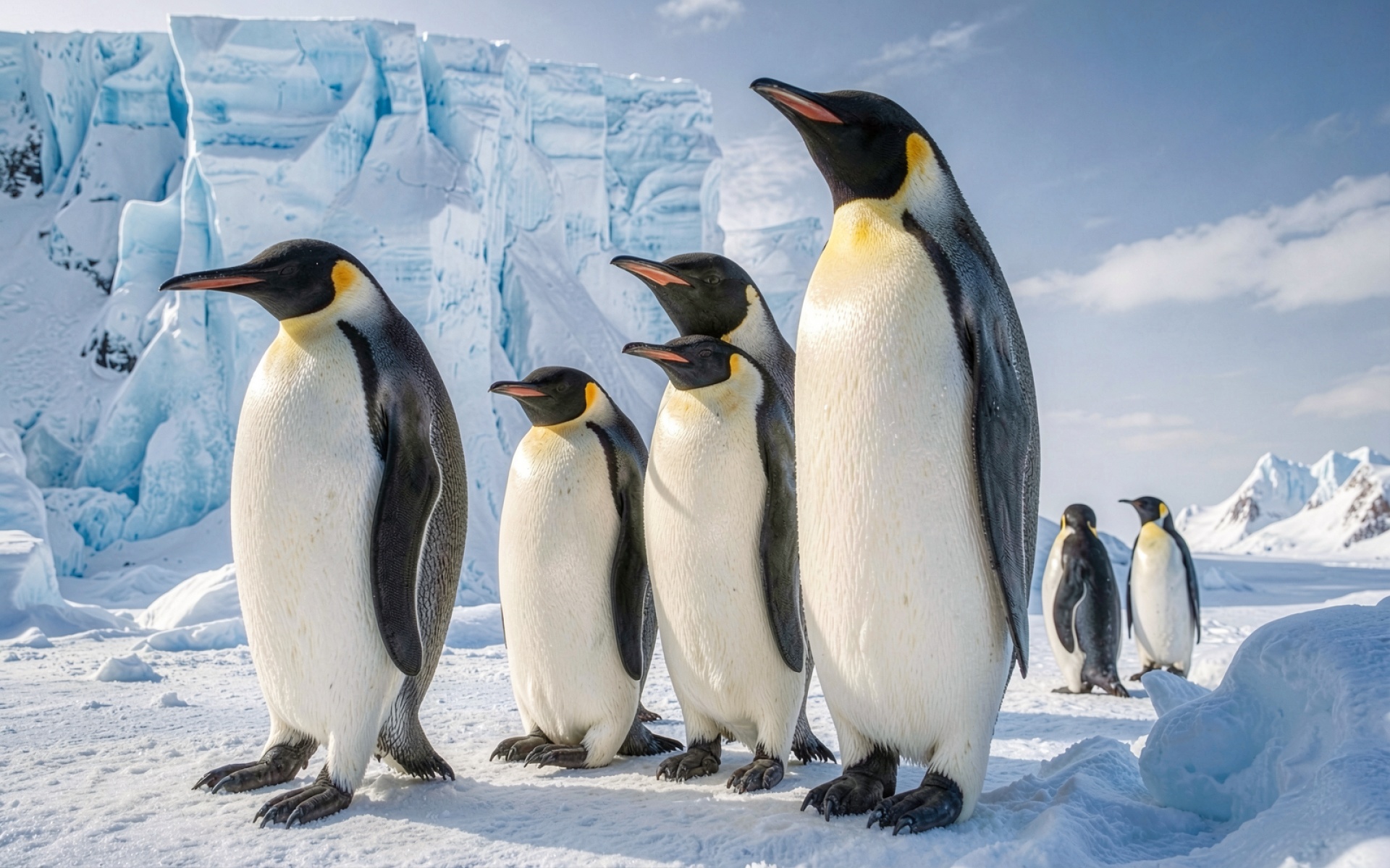 Королевские пингвины на фоне ледника Антарктиды