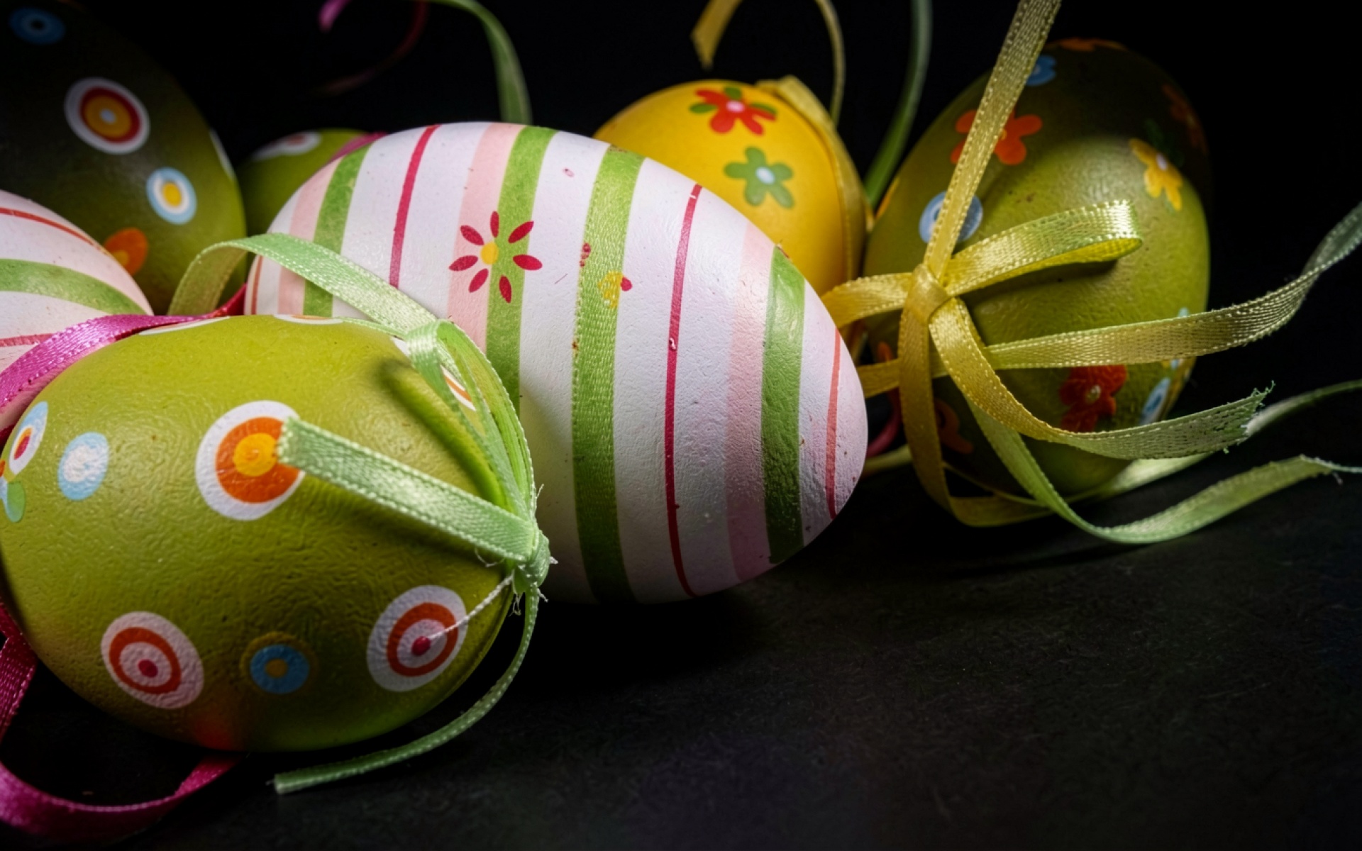 Разноцветные пасхальные яйца с лентами на черном фоне