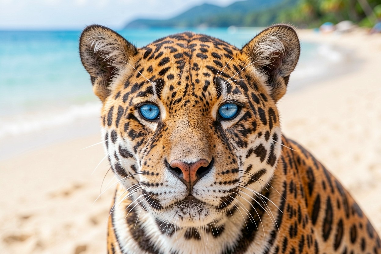 Леопард с голубыми глазами на песчаном пляже