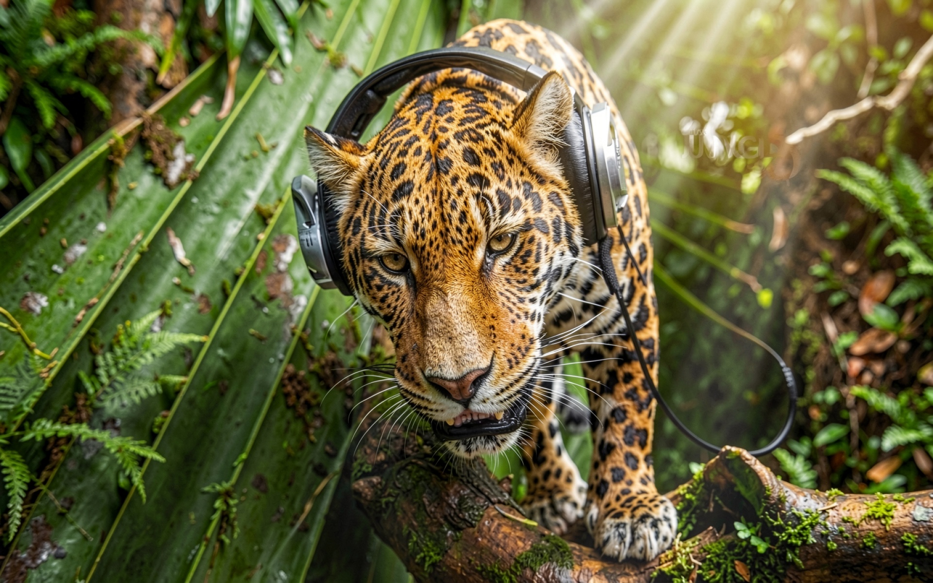 Леопард в наушниках в тропических джунглях
