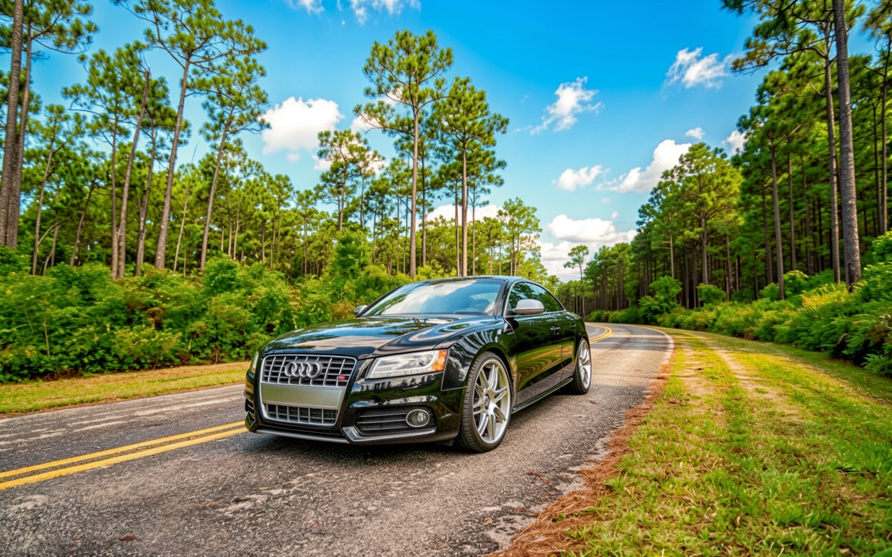 Черный автомобиль Audi на лесной дороге