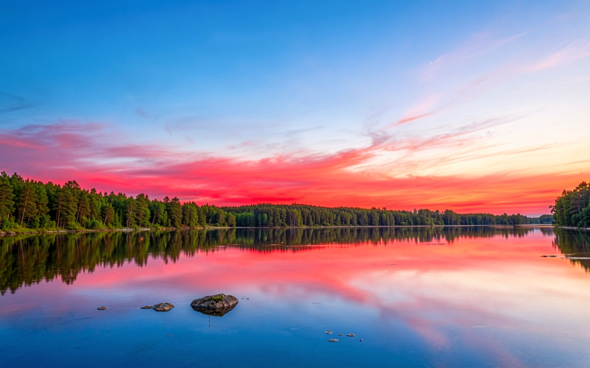 Закат над лесным озером в розовых тонах