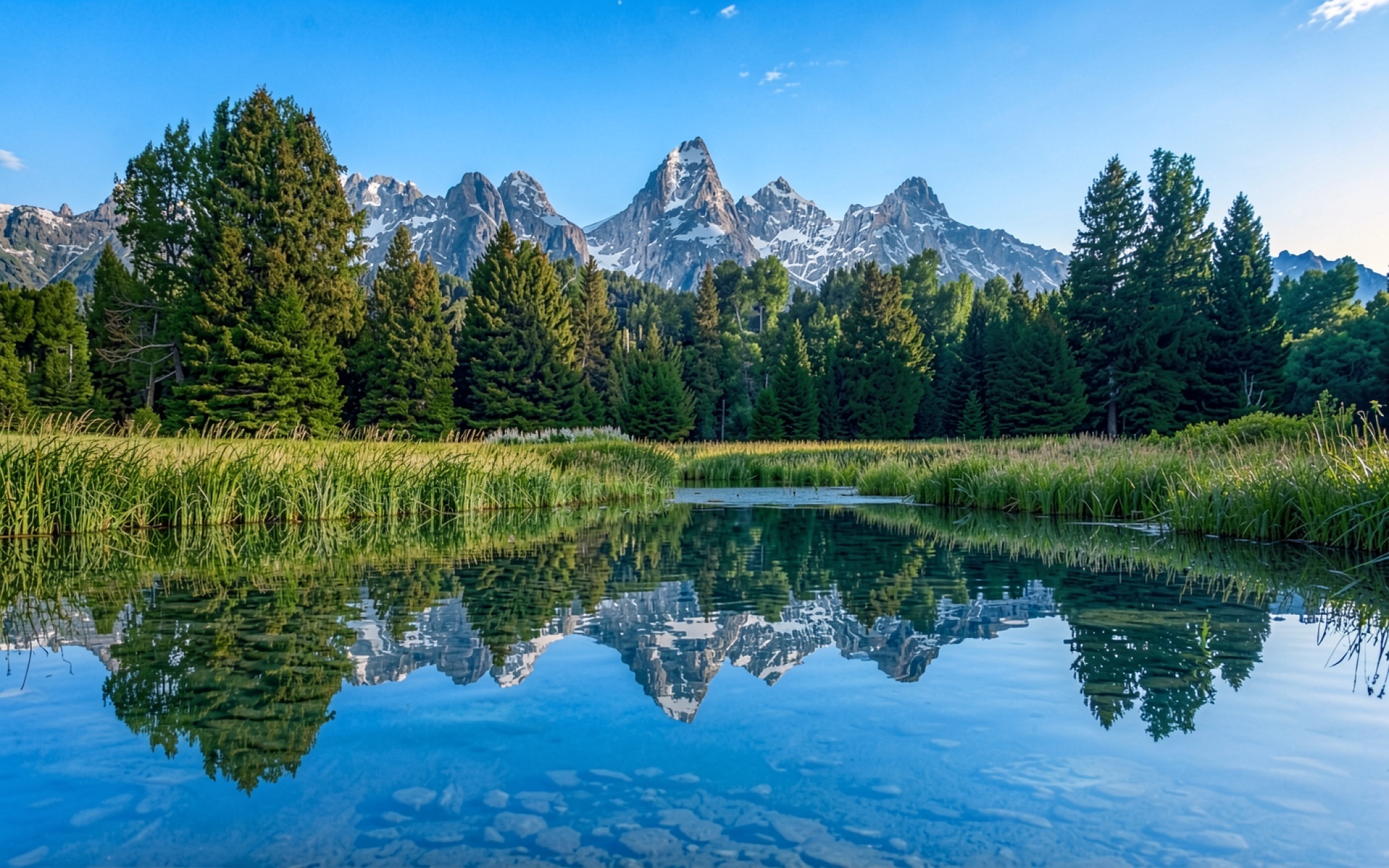 Заснеженные горы над хвойным лесом и озером