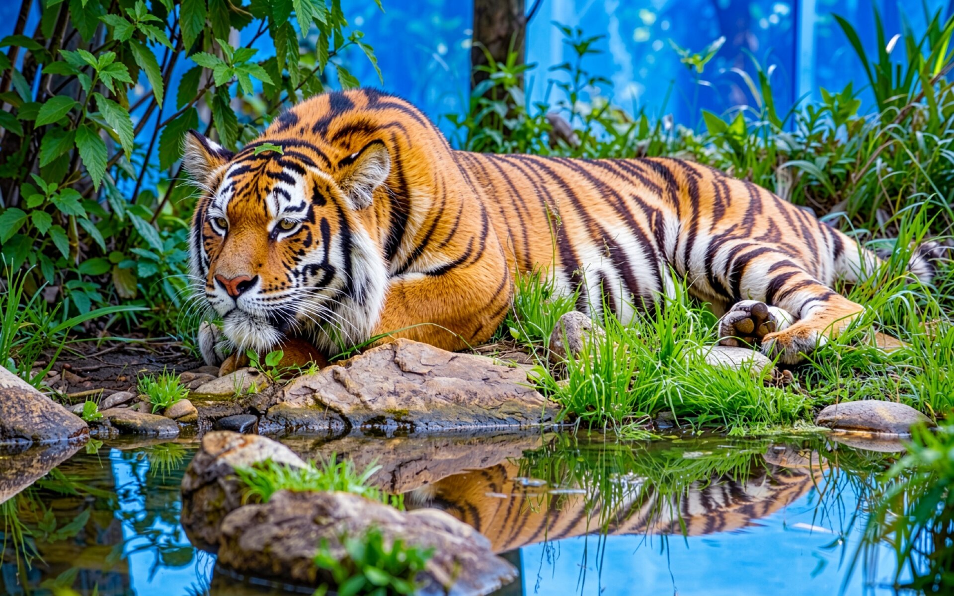 Бенгальский тигр в зеленом лесу у воды
