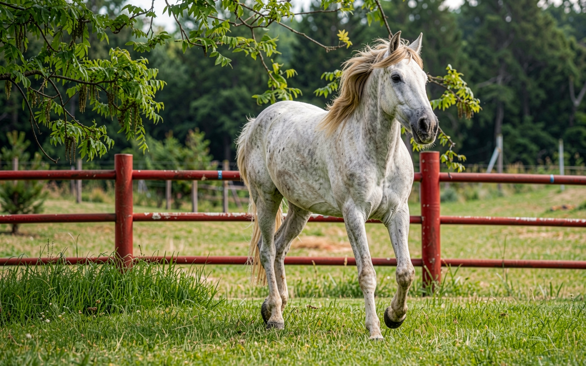 Белая лошадь в зеленом летнем загоне
