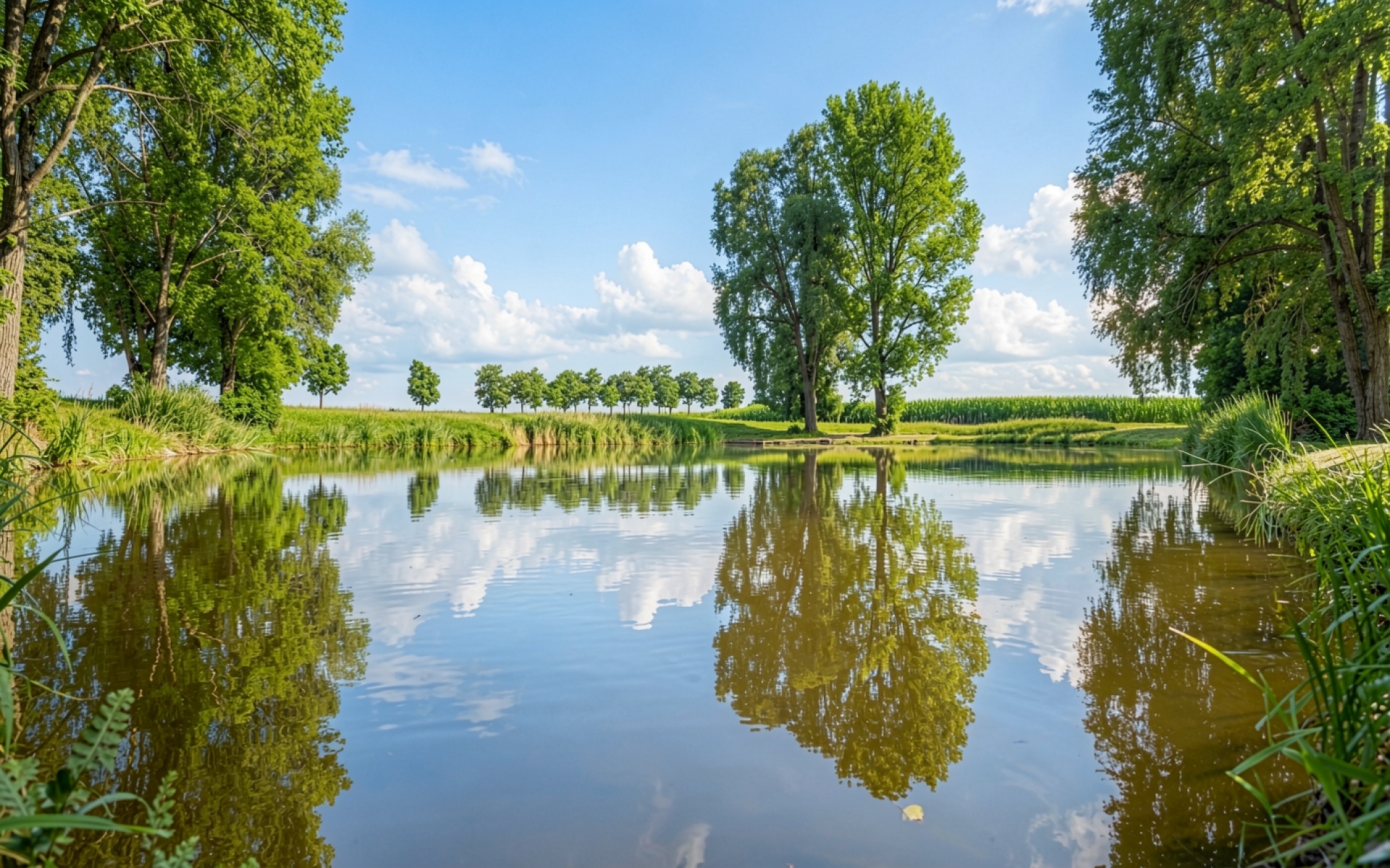 Летний пейзаж с озером и зелеными деревьями