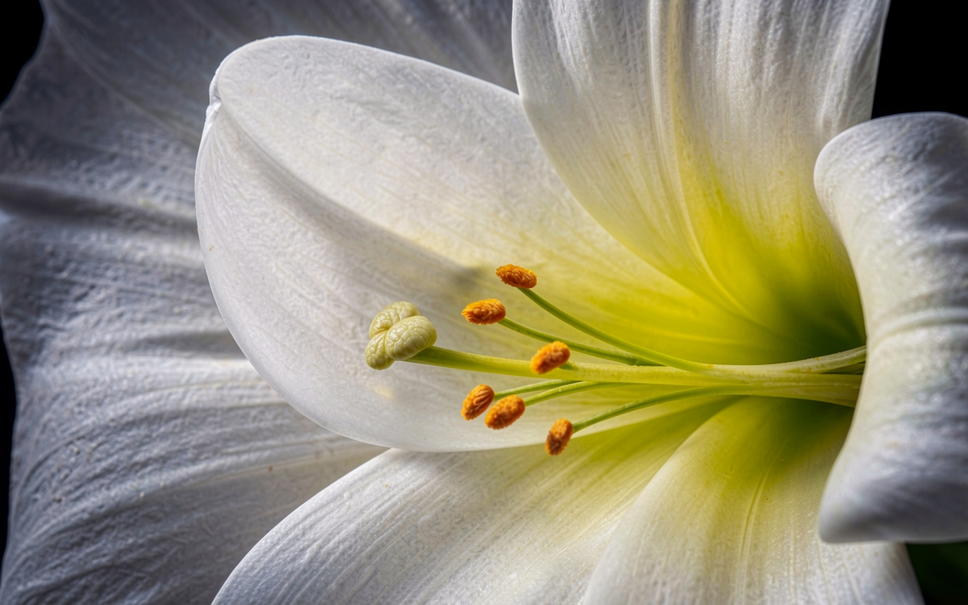 Белая лилия крупным планом на черном фоне
