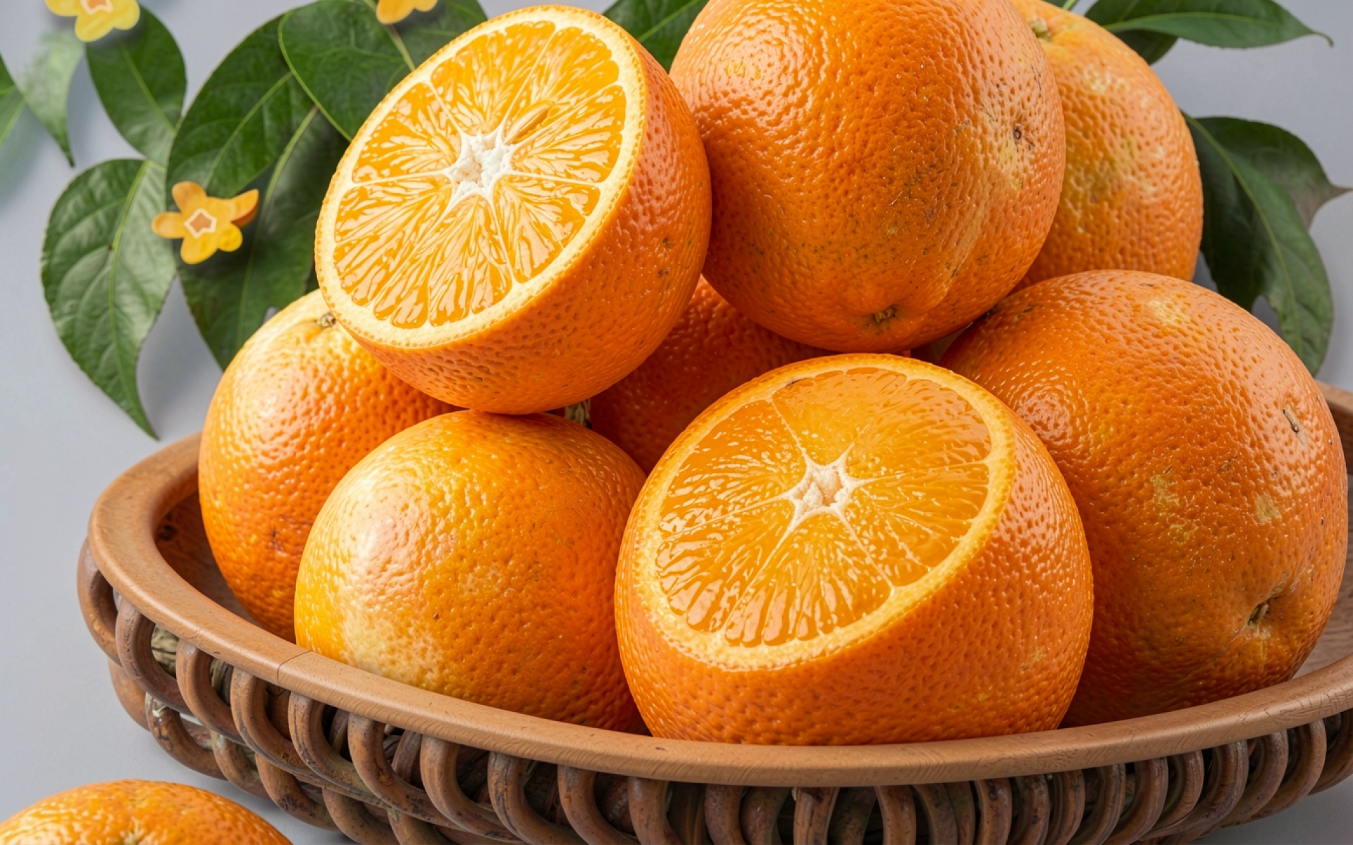 Спелые апельсины в плетеной корзине на фоне листьев