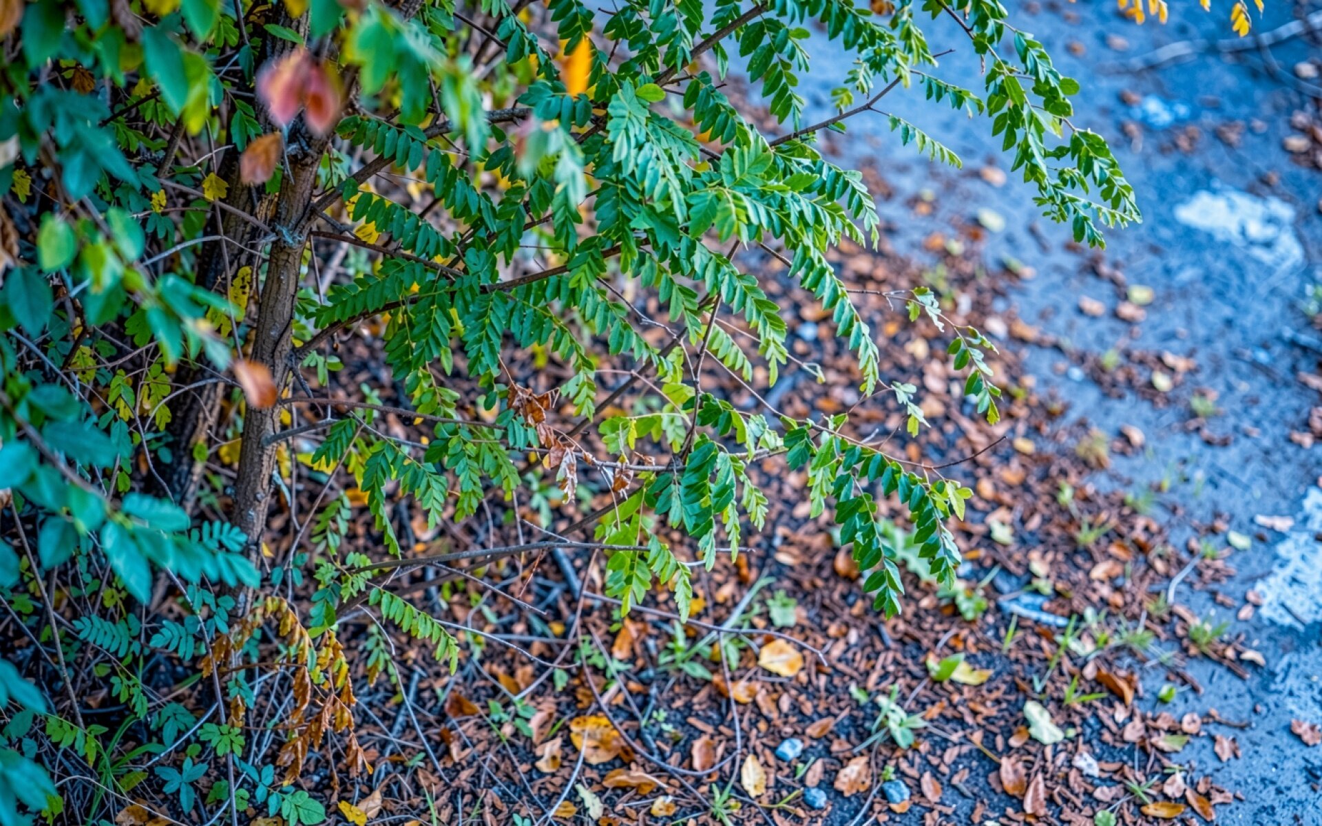 Зеленый куст с осенними листьями на асфальте