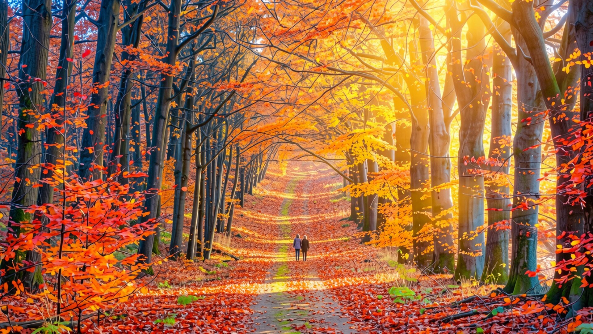 Осенний лес с рыжими листьями и парой