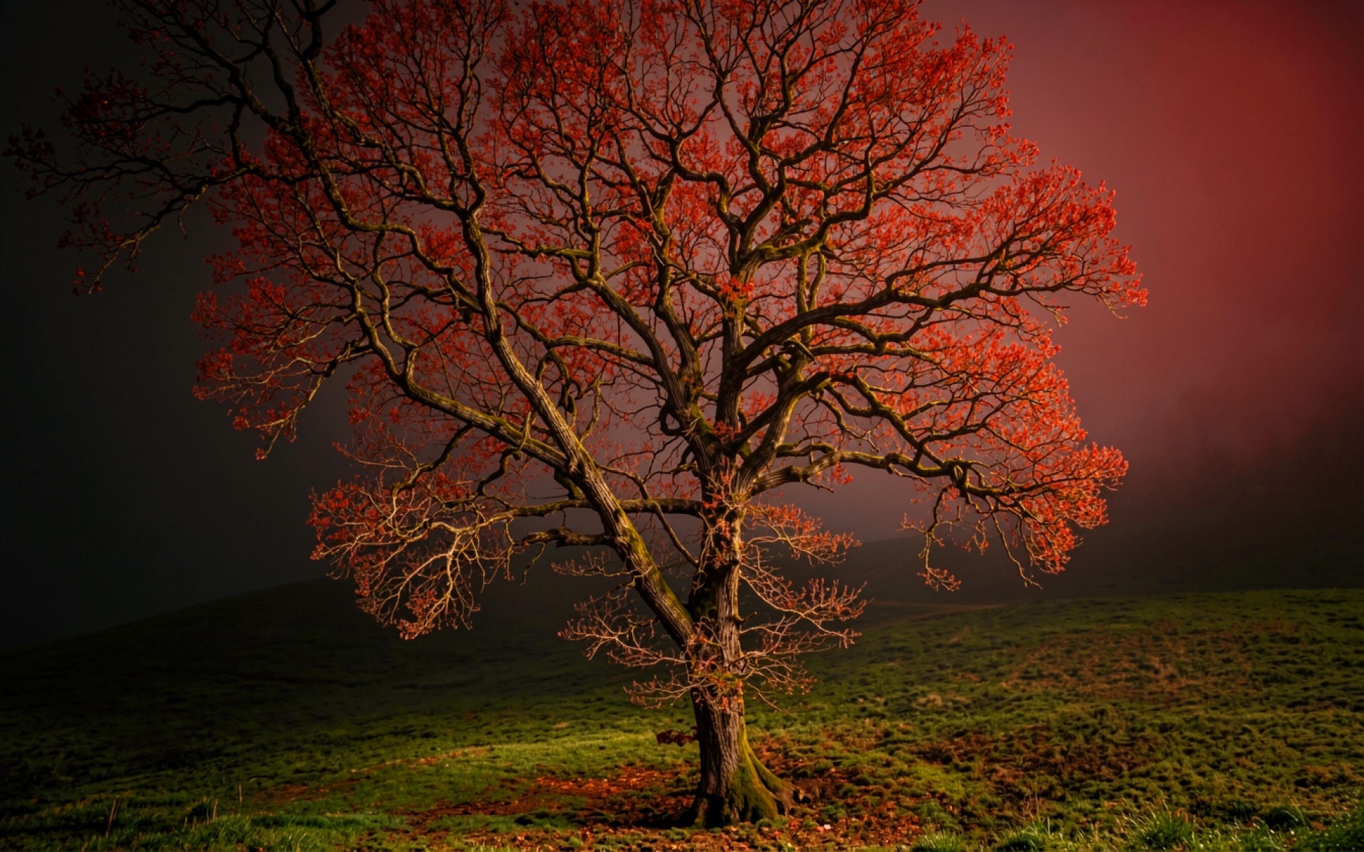 Одинокое дерево с красными листьями в тумане