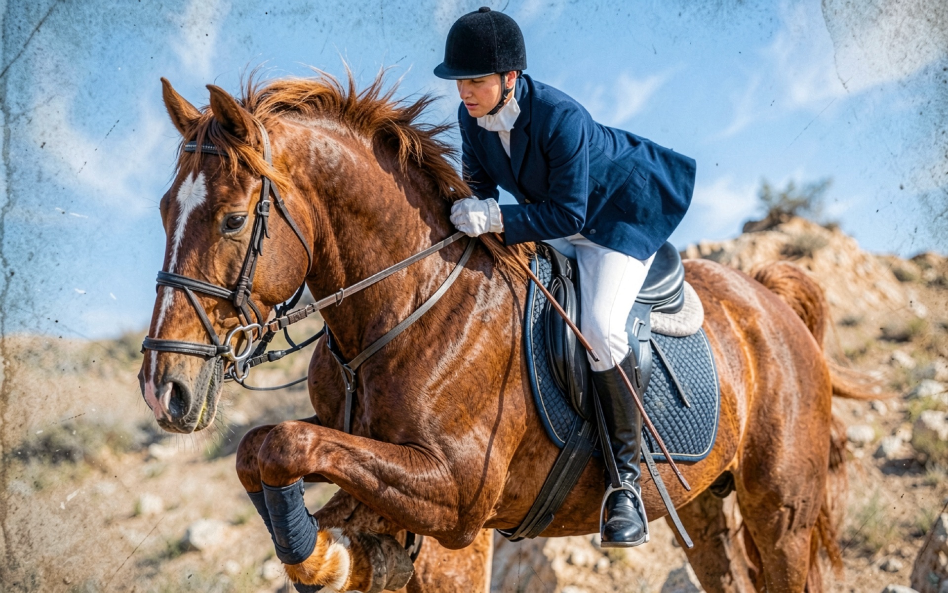 Всадник на рыжей лошади в горах