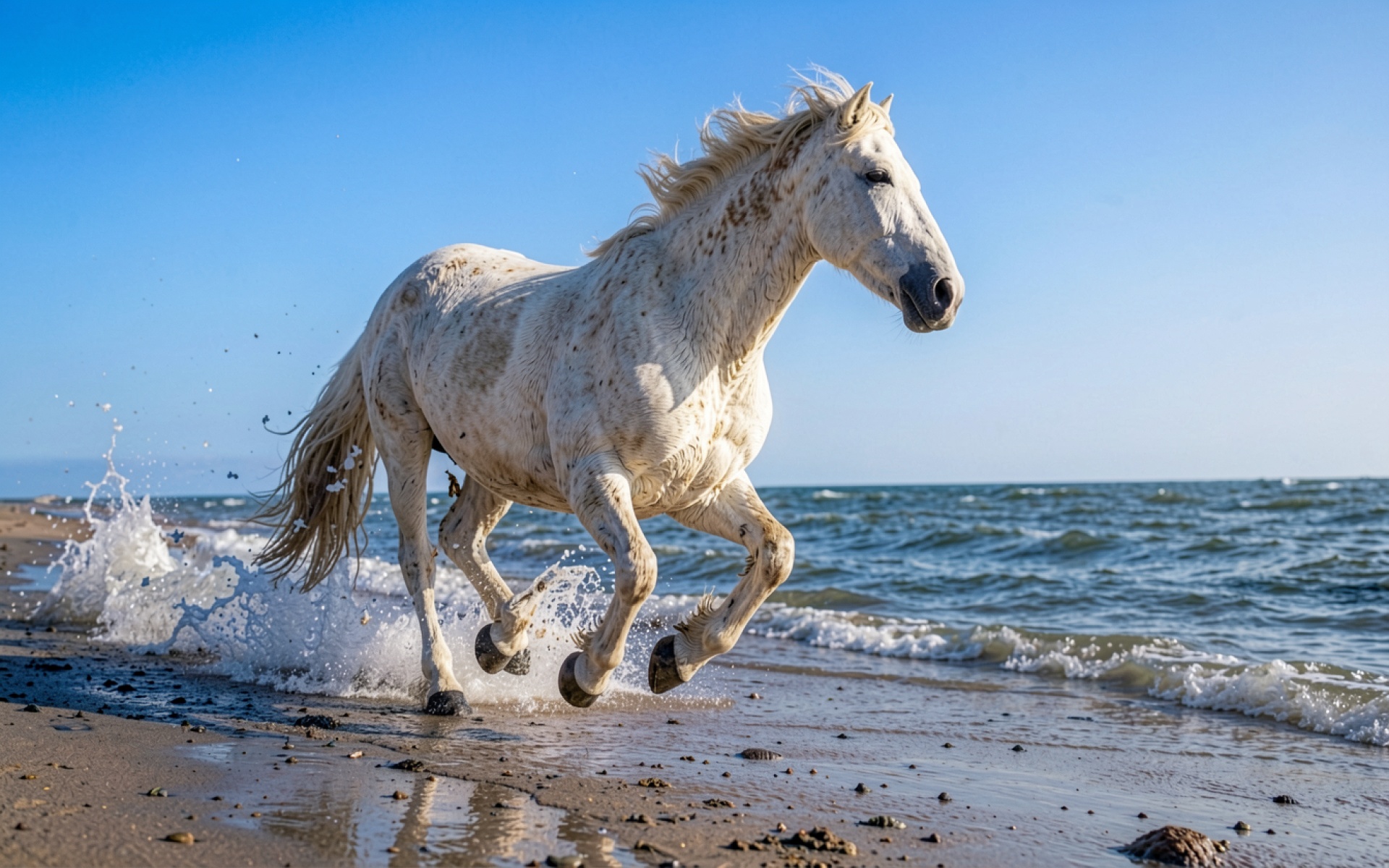Белая лошадь на песчаном пляже у моря