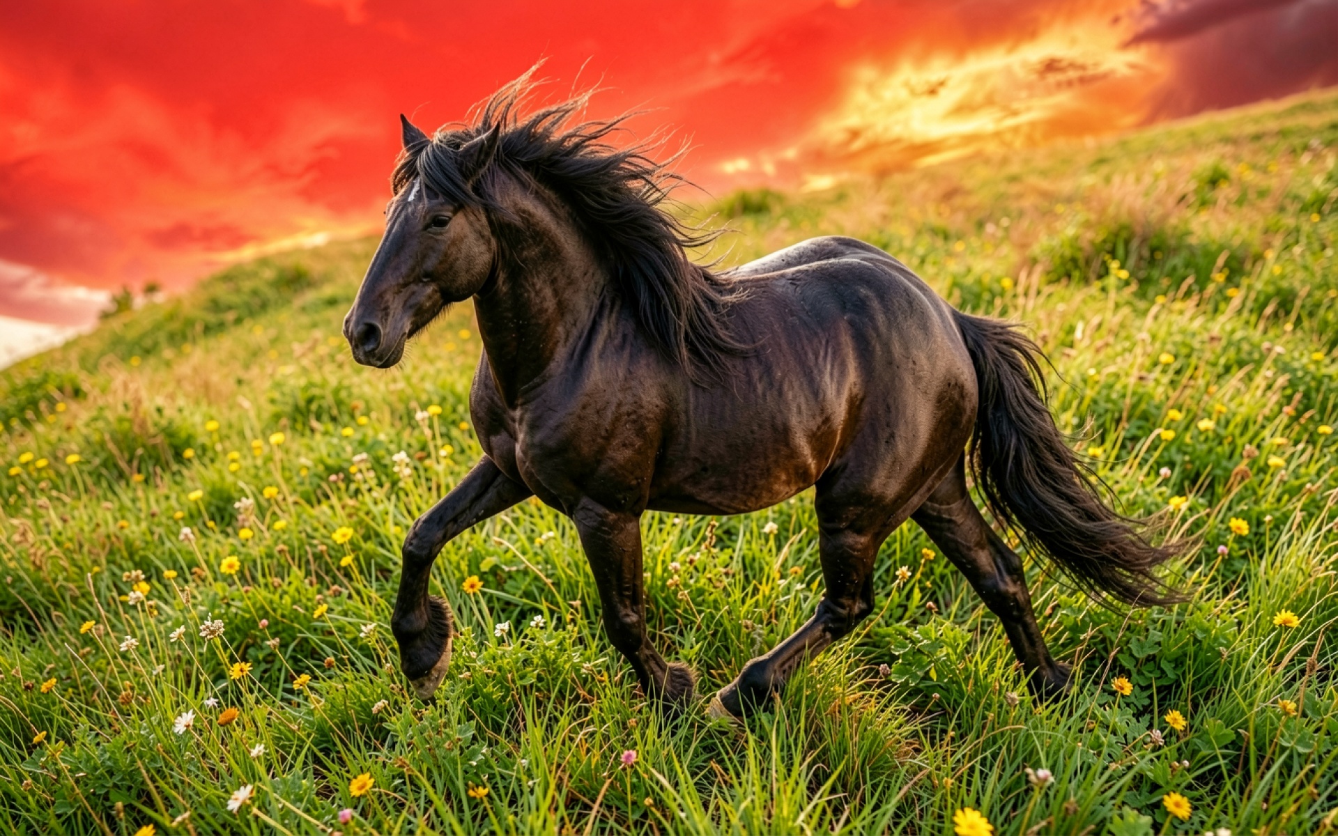 Черный конь на зеленом лугу закат