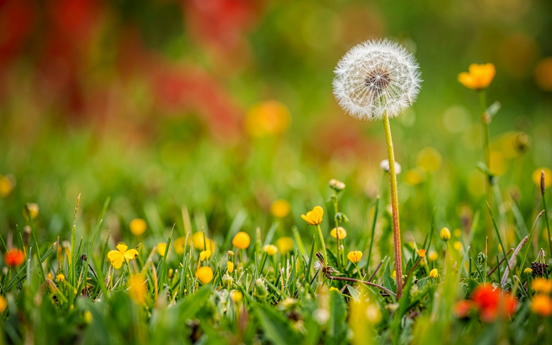 Белый одуванчик в зеленом лугу с цветами