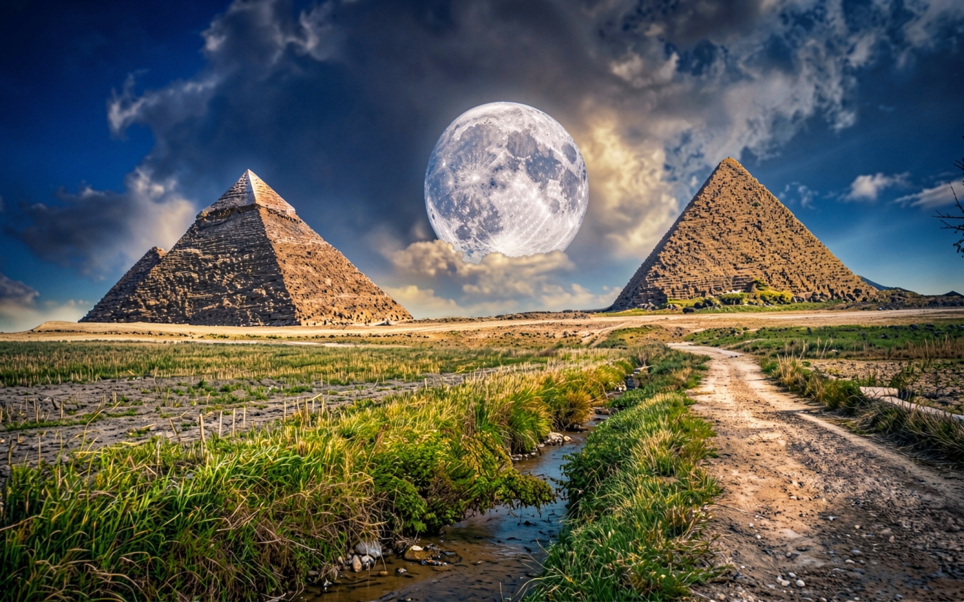 Пирамиды Гизы с огромной луной ночью