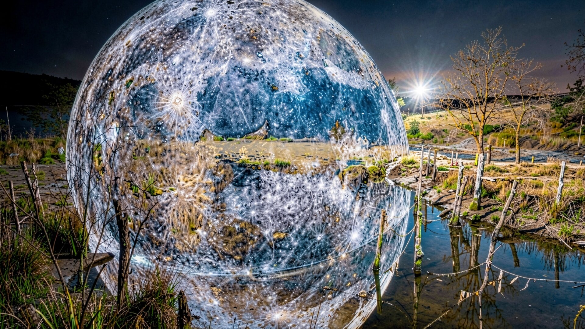 Стеклянная сфера в осеннем пейзаже с лучами солнца