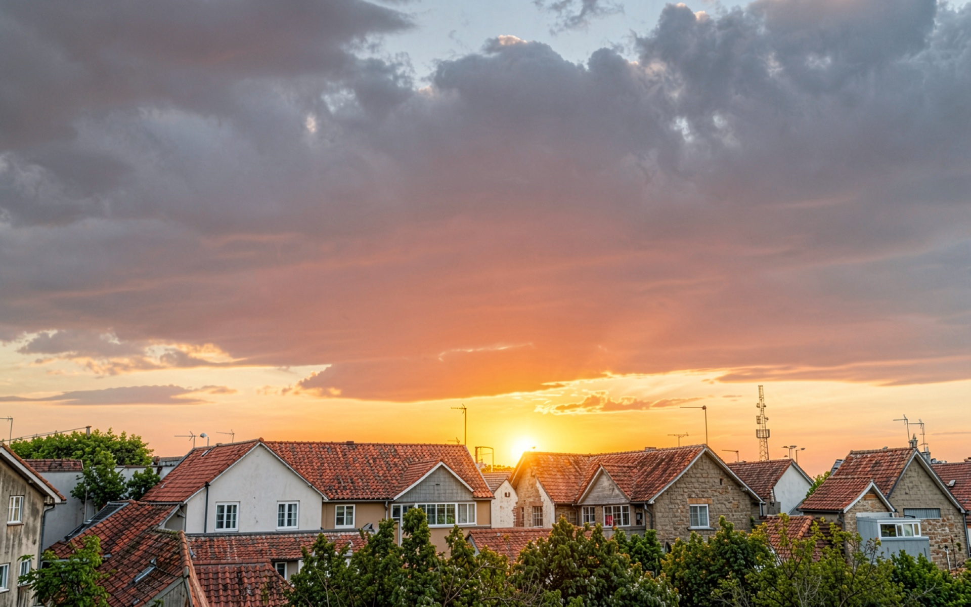 Крыши европейского города в лучах заката