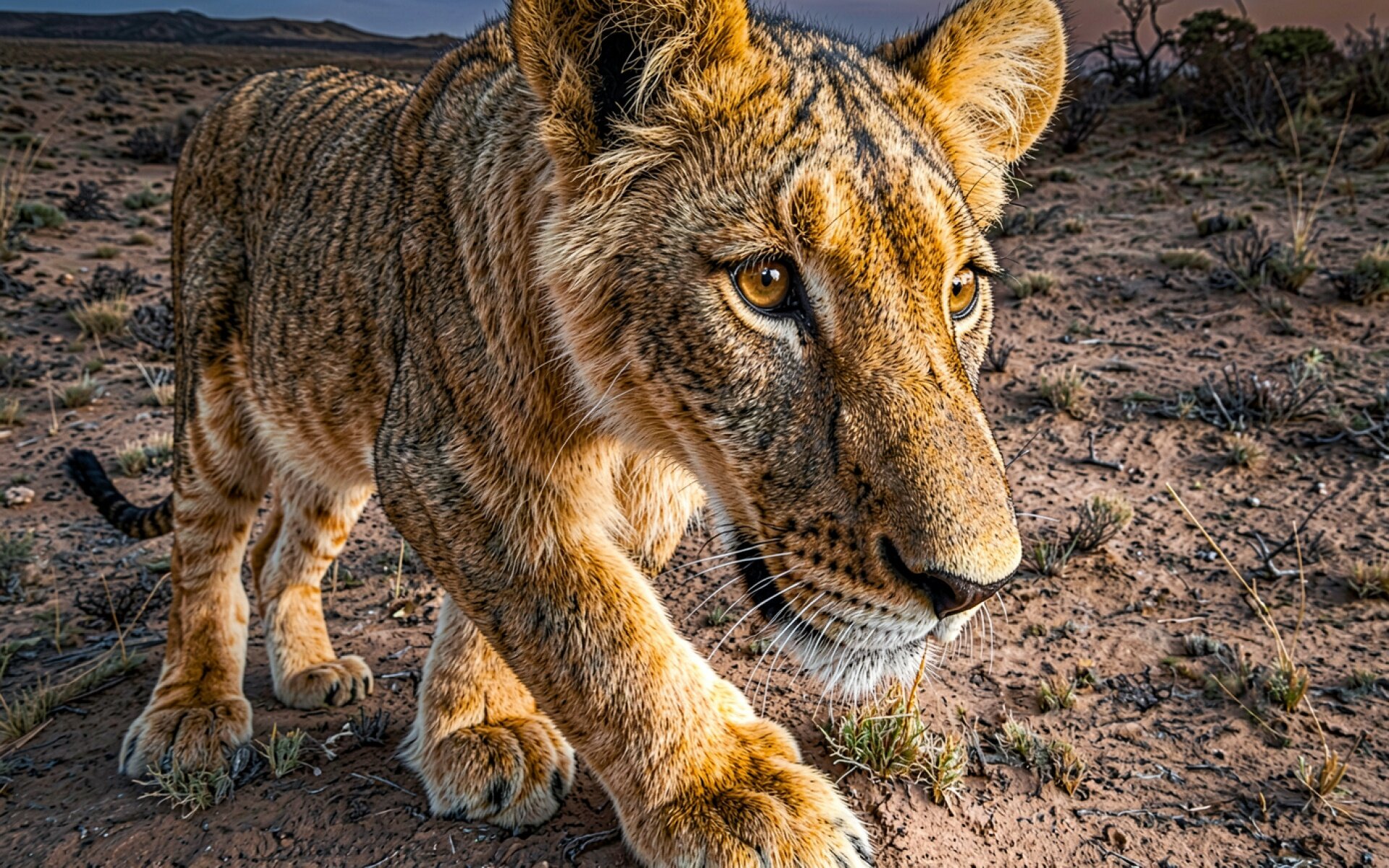 Львенок золотистого цвета в засушливой саванне