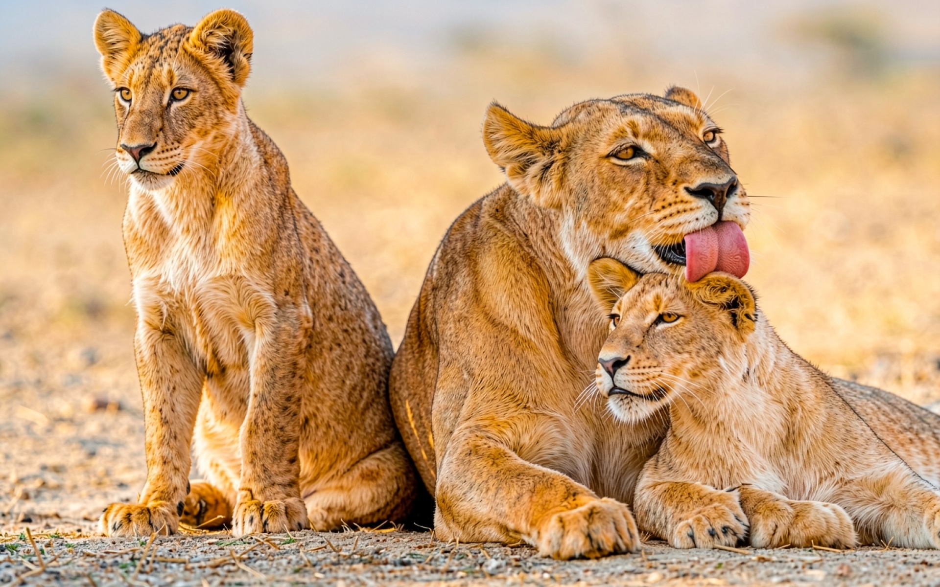 Львица с двумя львятами в саванне при свете солнца