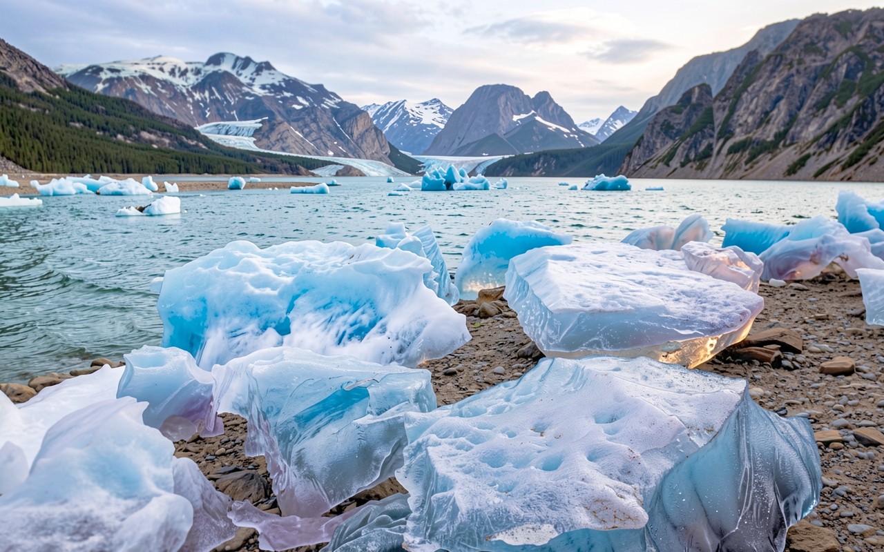 Голубые льдины на берегу горного озера