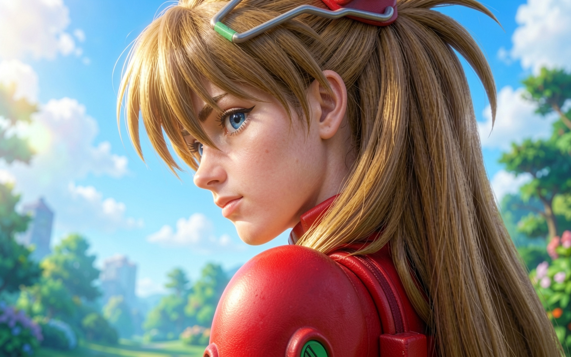 Аска Лэнгли Сорью в красном комбинезоне на фоне города