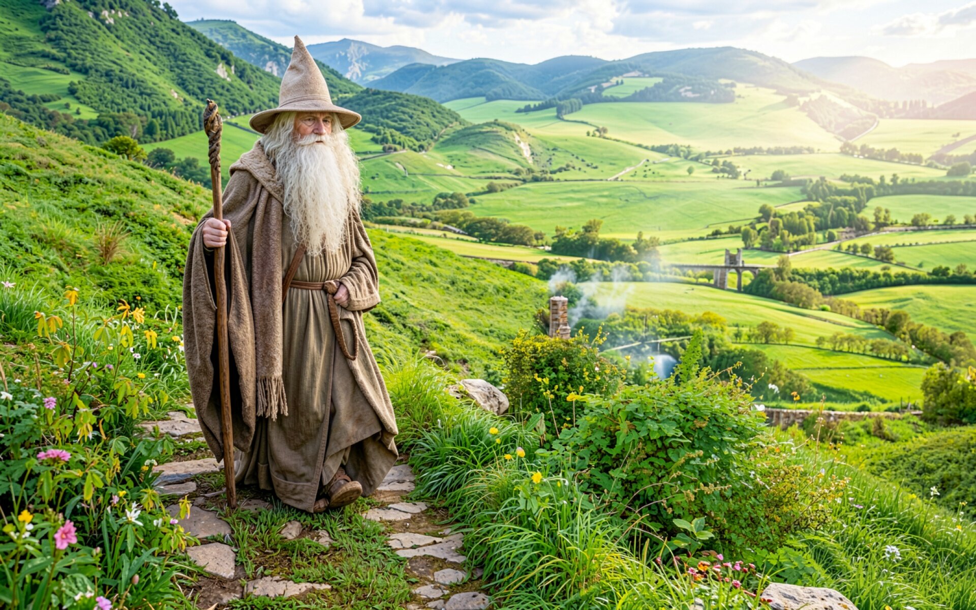 Маг Гэндальф в зеленом холмистом пейзаже
