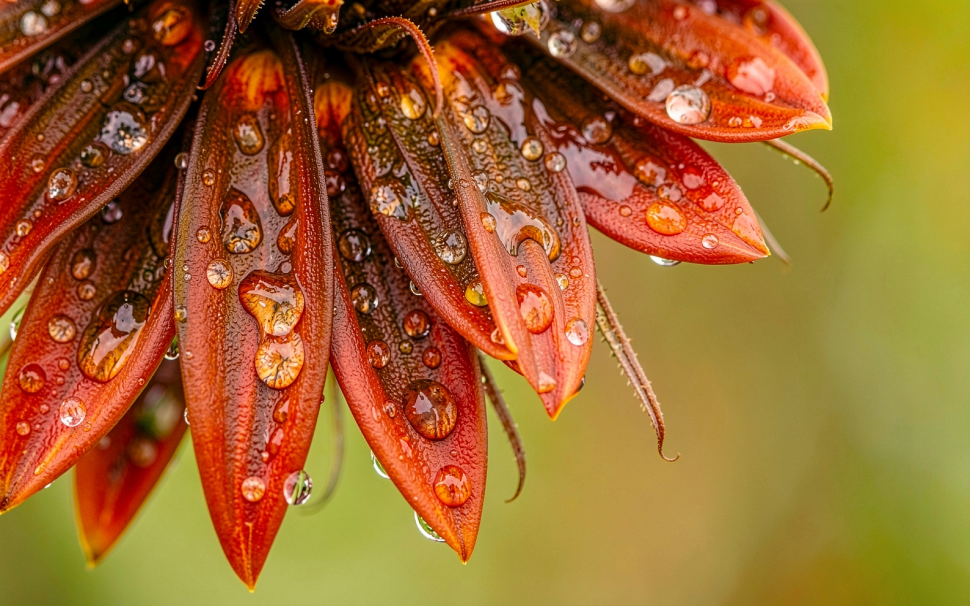 Красный цветок с каплями росы макро