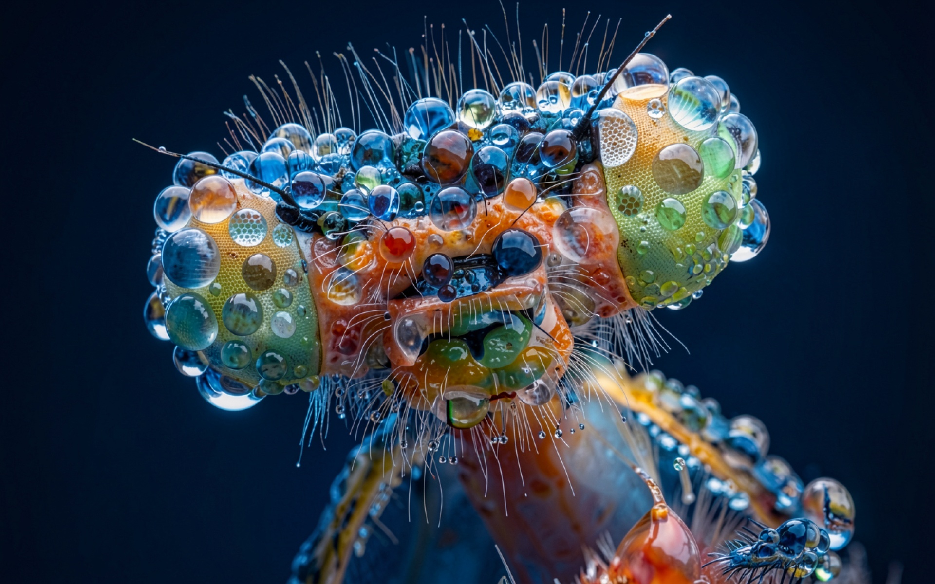 Макроснимок насекомого с каплями росы синий фон
