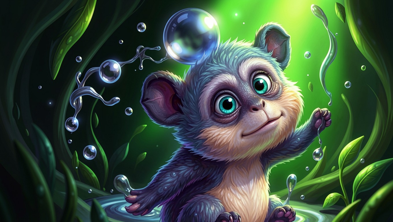 Маленькая синяя обезьянка с мыльными пузырями в джунглях