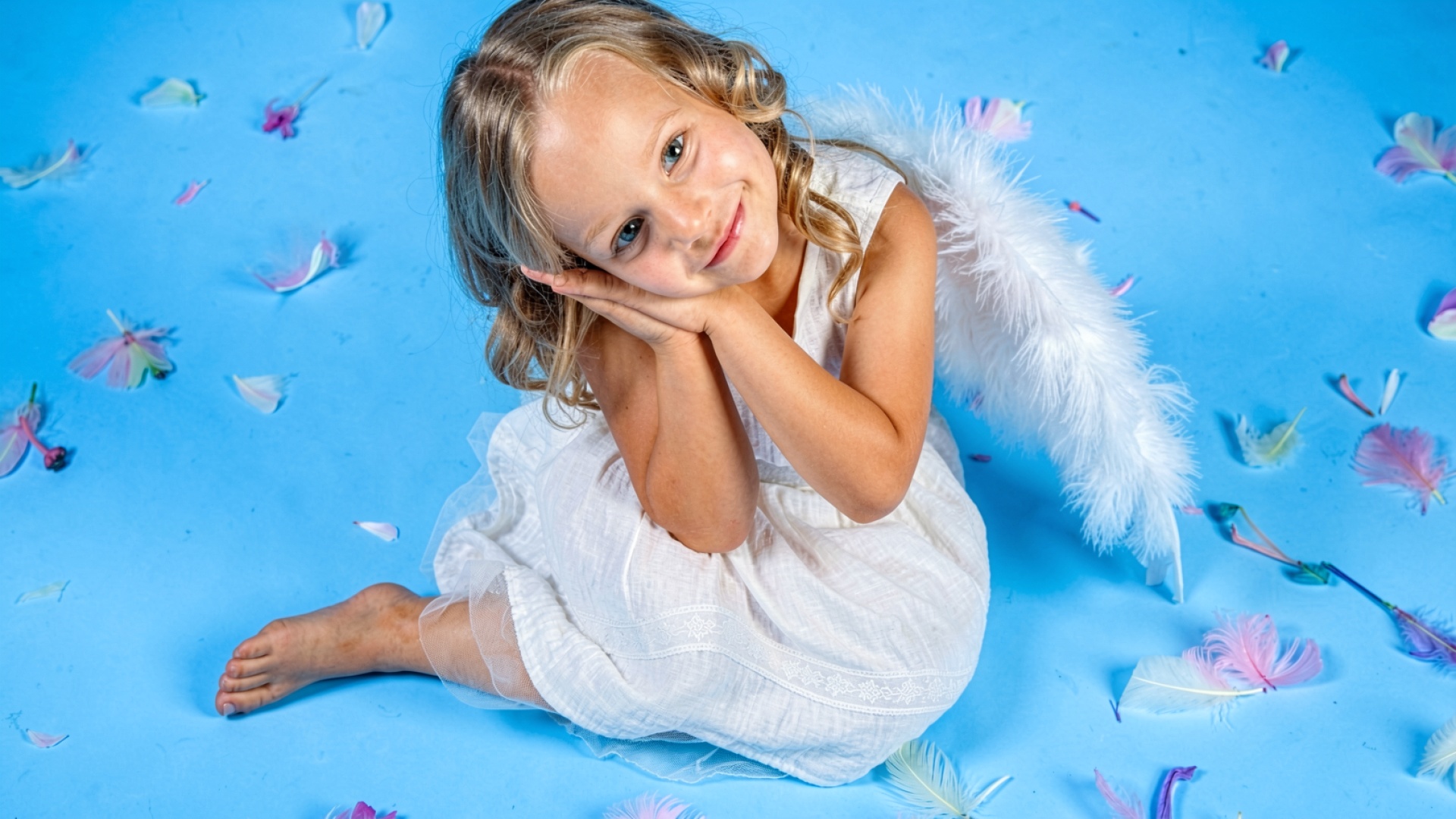 Маленький ангел в белом платье на голубом фоне