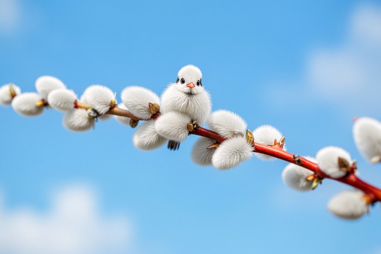 Маленький белый цыпленок на ветке вербы