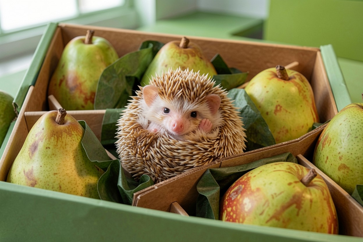 Маленький еж в коробке с зелеными грушами