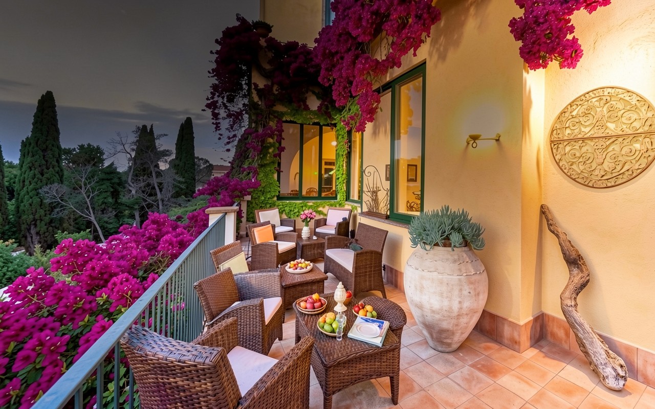 Терраса с плетеной мебелью и розовой бугенвиллеей