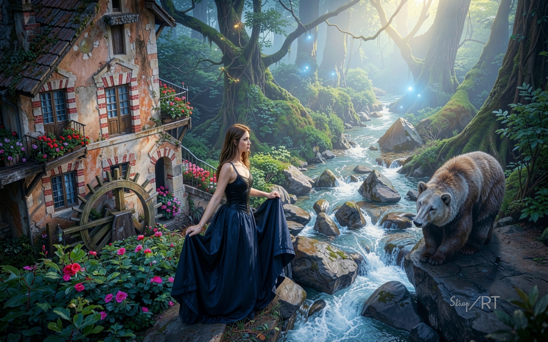 Девушка в черном платье с медведем у мельницы