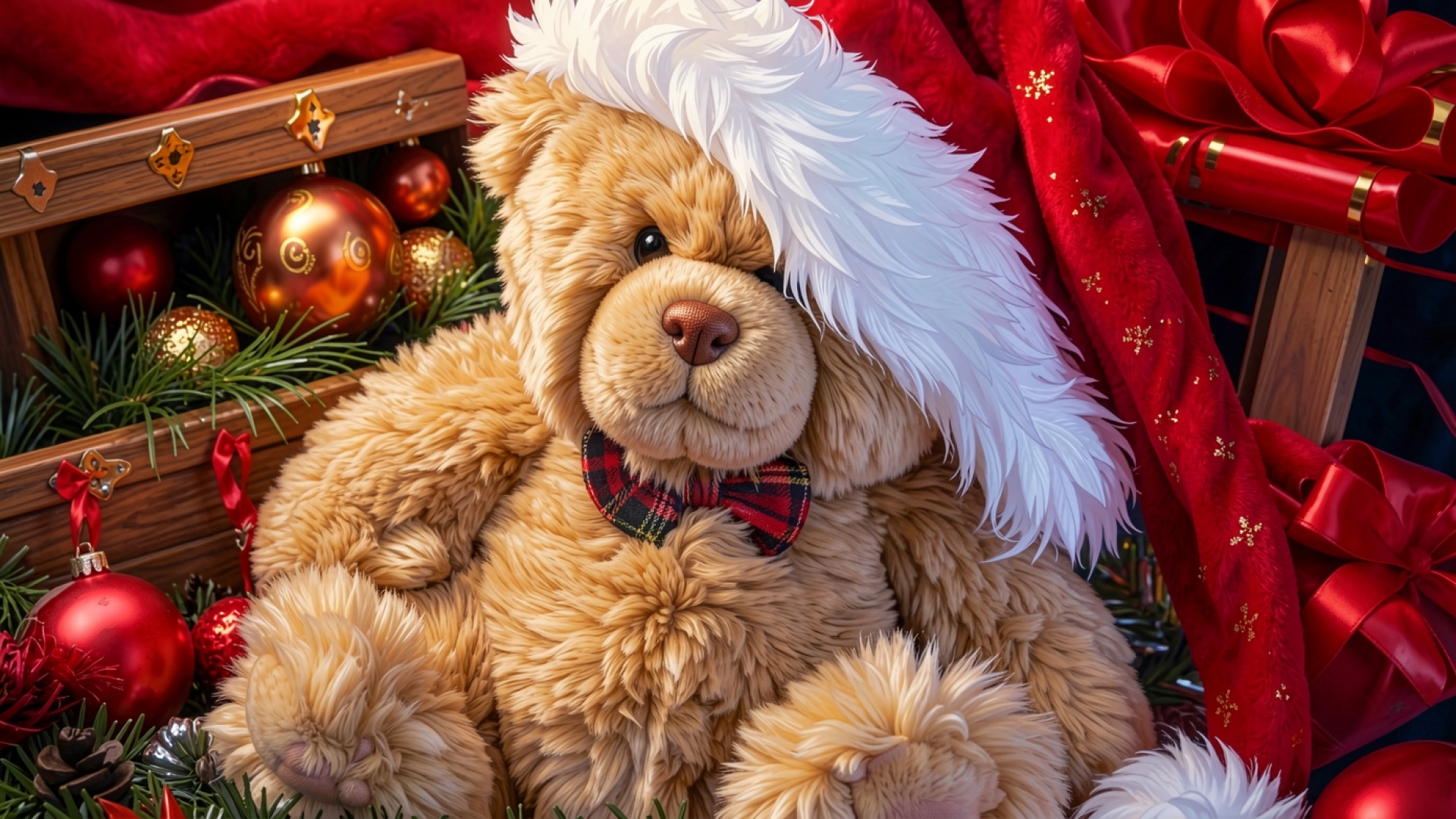 Плюшевый медведь в красном новогоднем колпаке