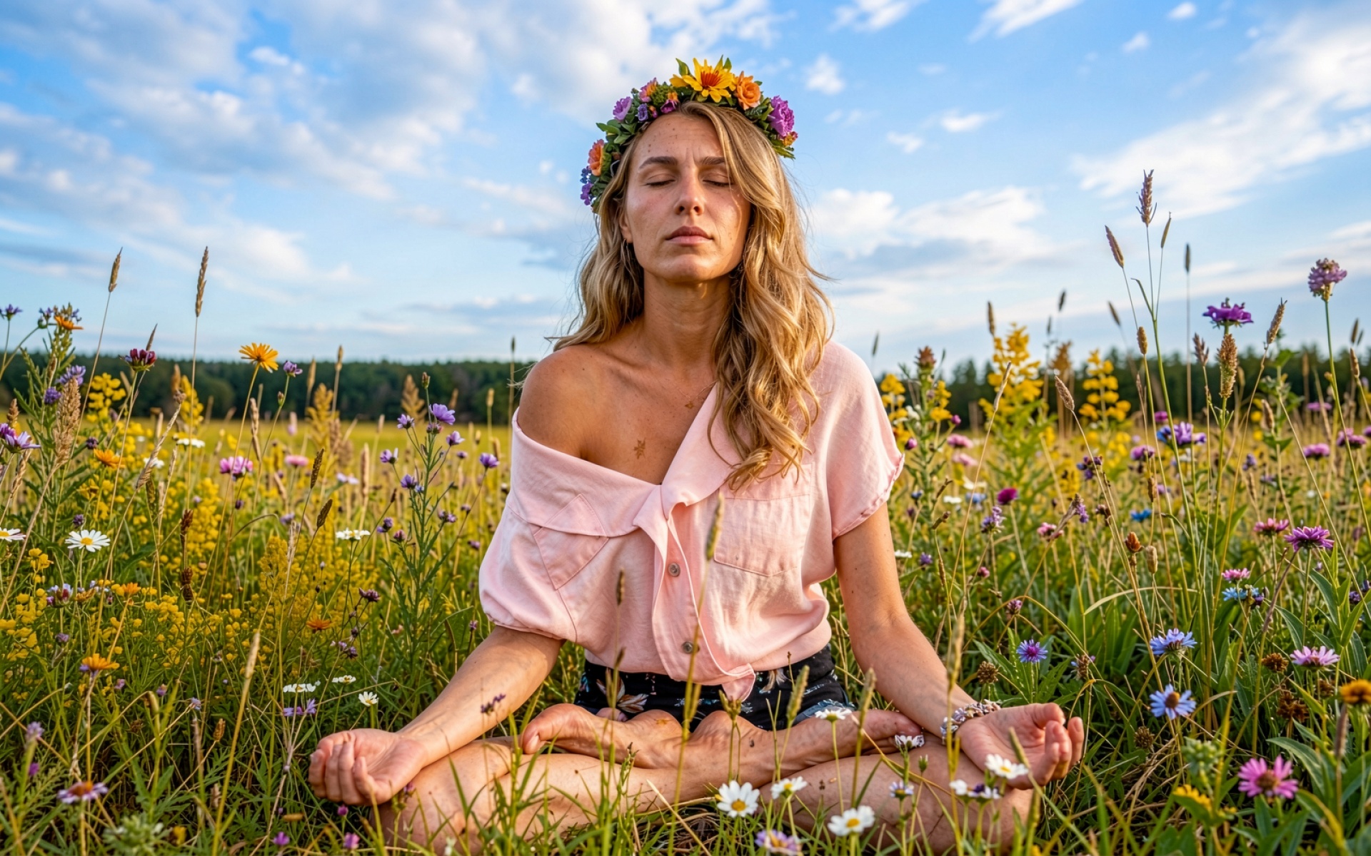 Девушка в цветочном венке медитирует поле