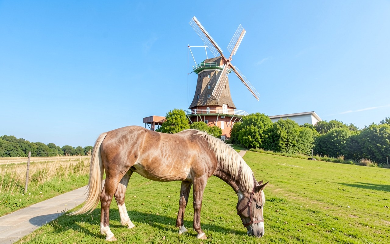 Коричневая лошадь у ветряной мельницы в деревне