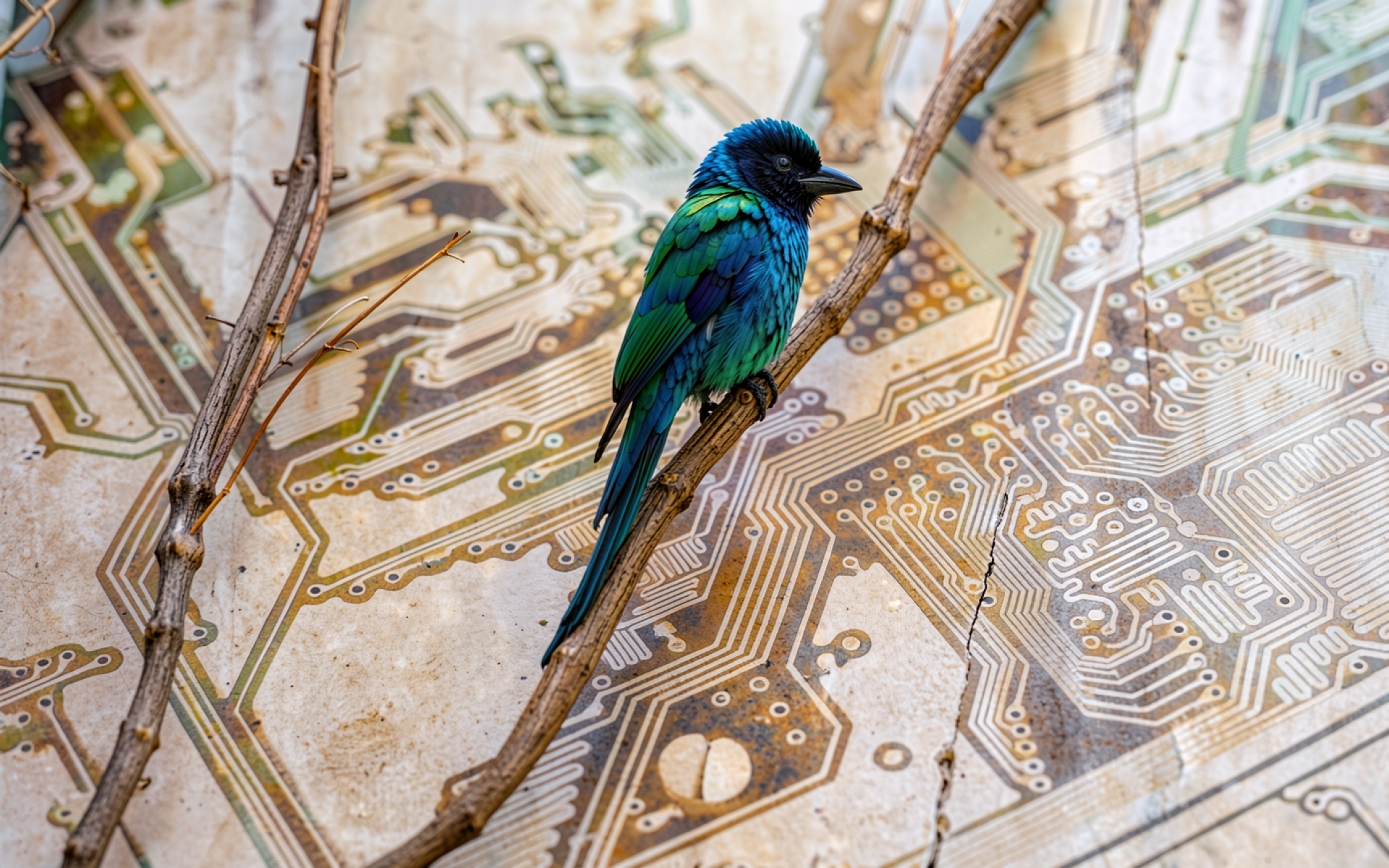 Синий птица на ветке перед микросхемой