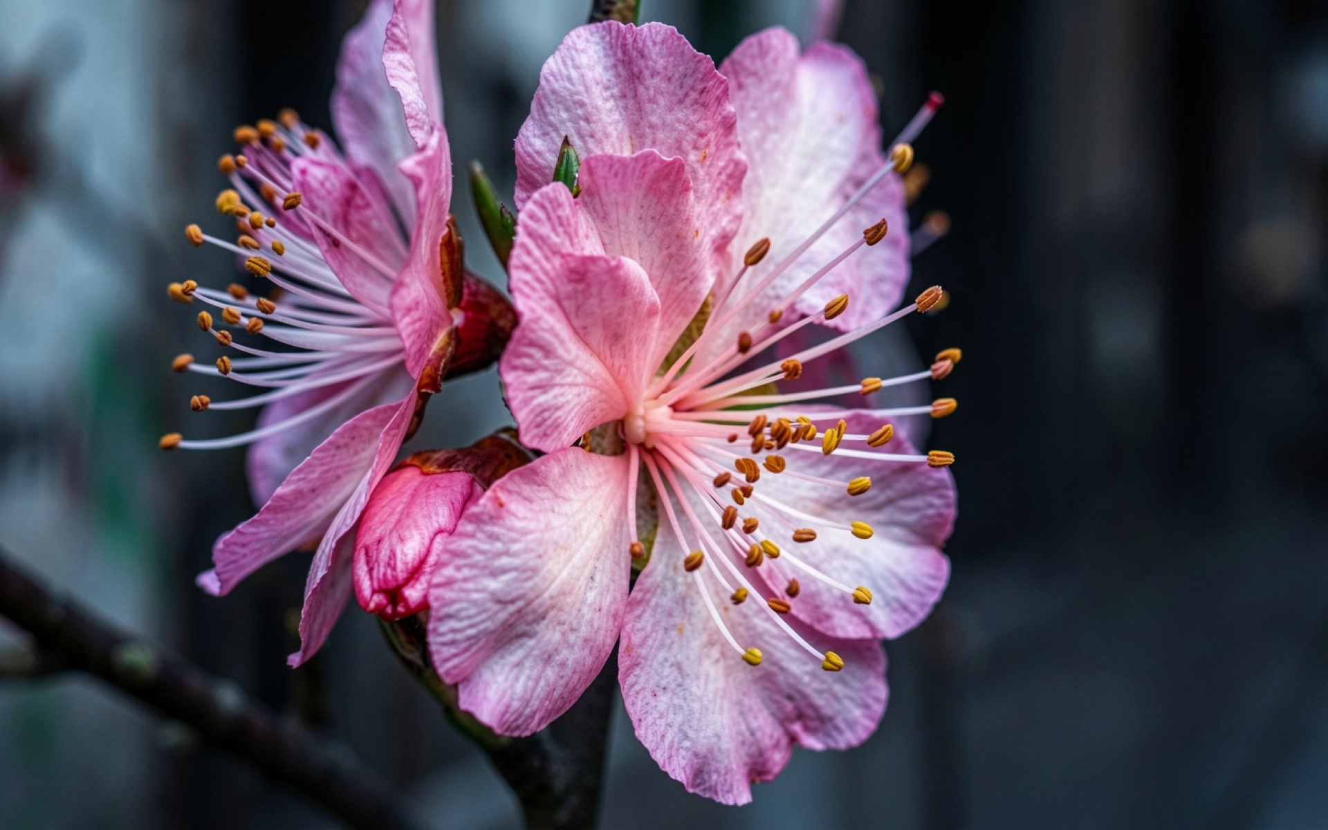 Розовые цветы миндаля на темном фоне