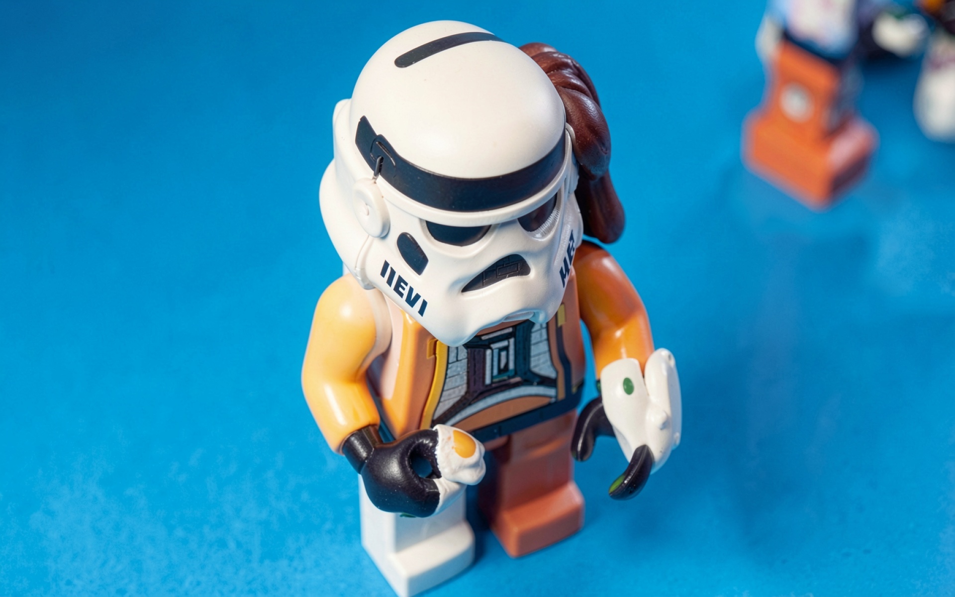 Минифигурка штурмовика в оранжевой броне на синем фоне