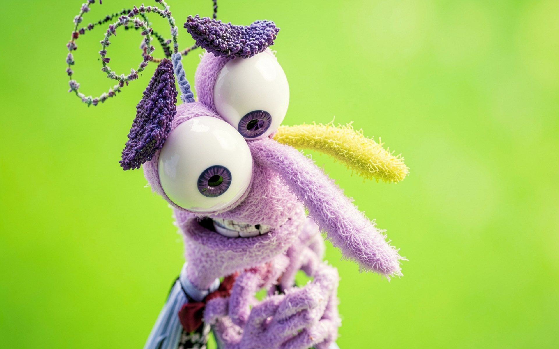 Фиолетовый монстр с желтым носом на зеленом фоне