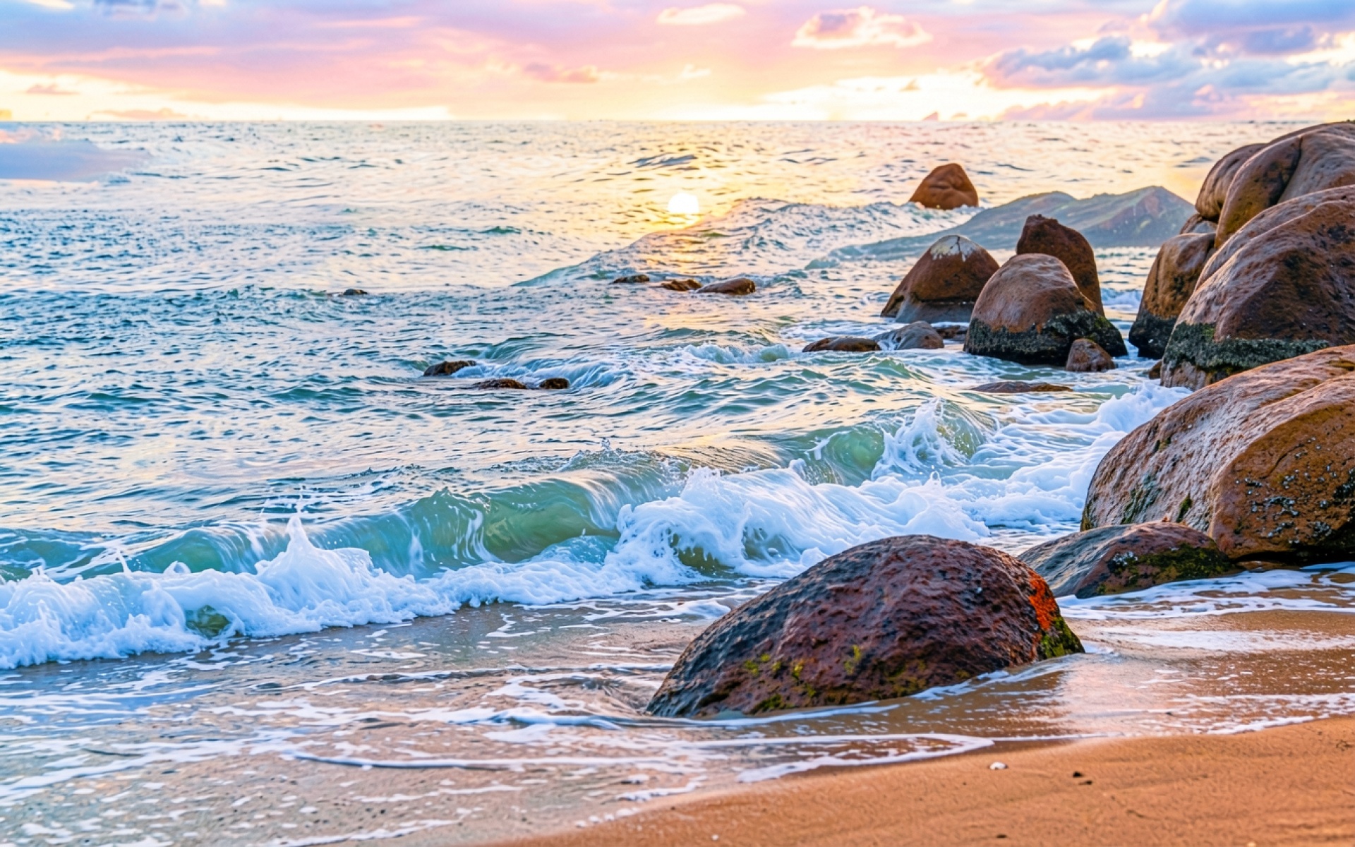 Морской берег с камнями в закатном свете