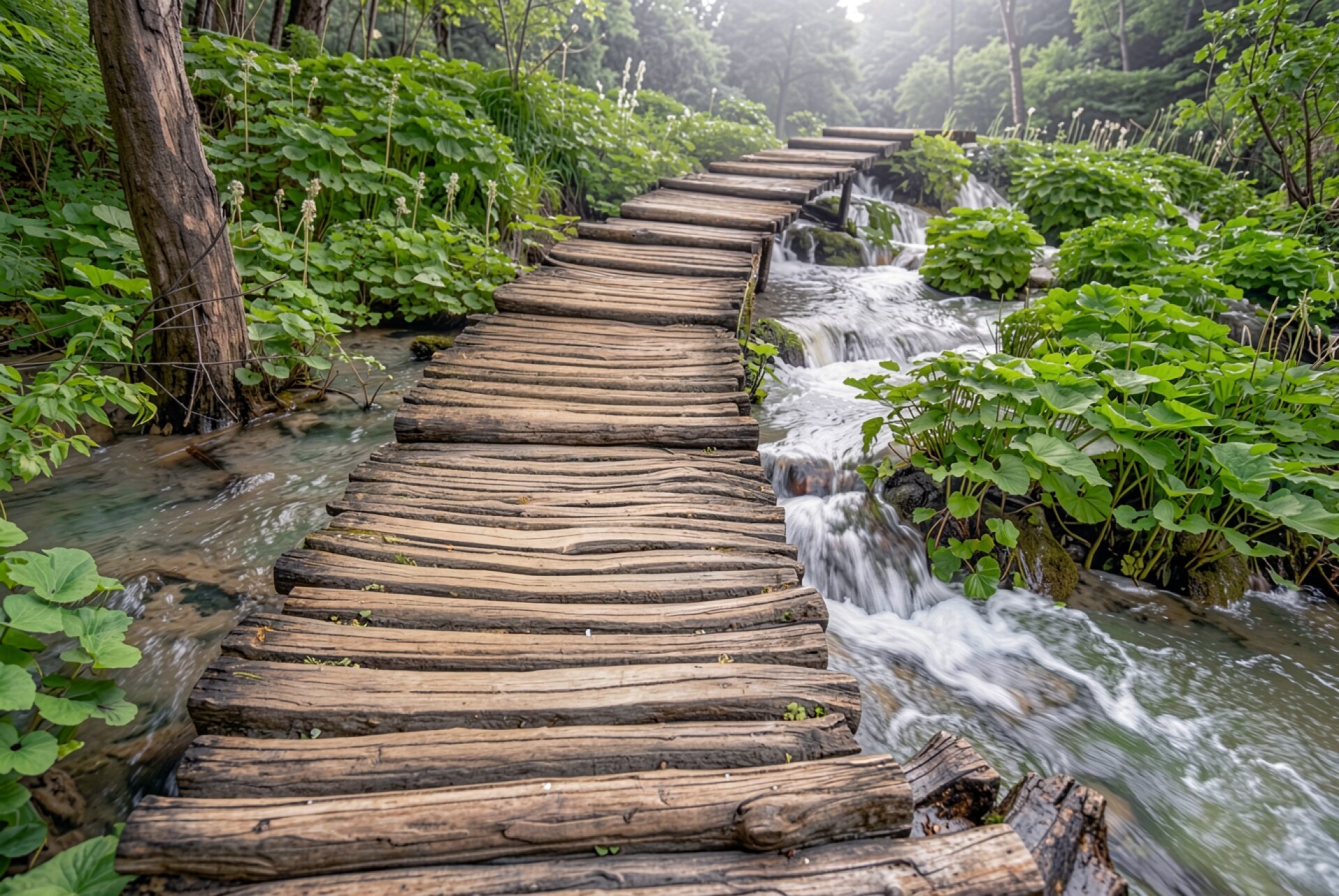Деревянный мостик в зеленом летнем лесу
