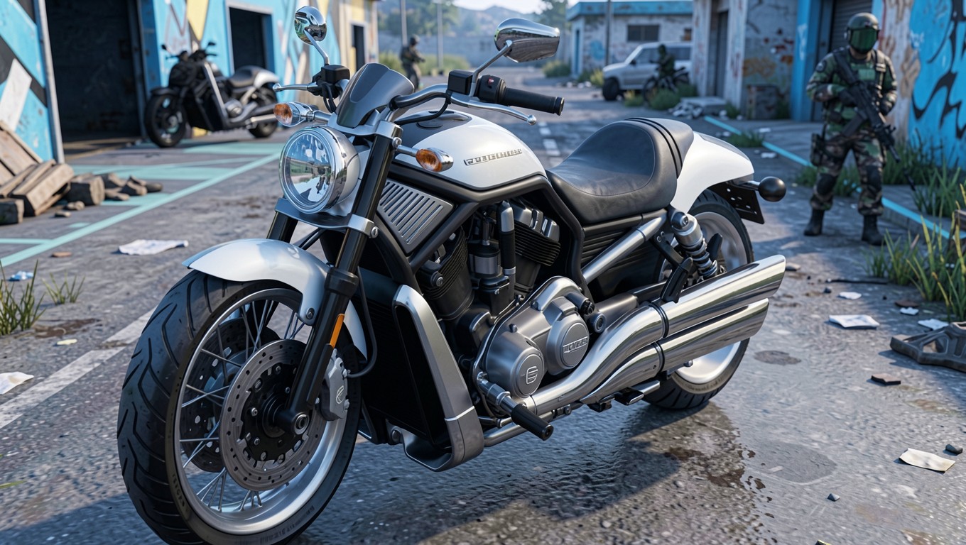 Белый мотоцикл в городском индустриальном окружении